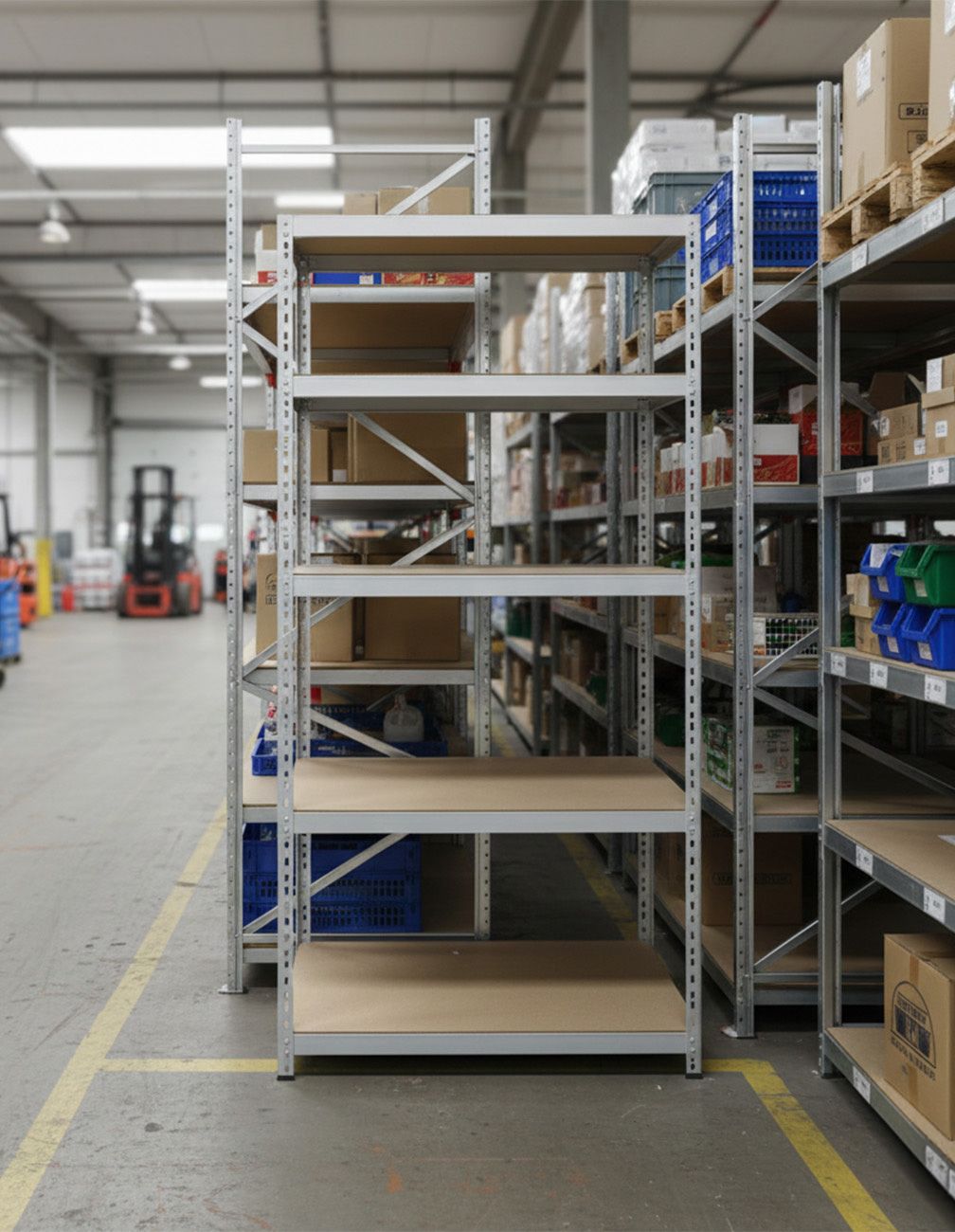 Regal in verzinkter Ausführung. Die Böden bestehen aus 50 mm hohen Stahlrahmen mit aufgelegten, 10 mm starken Spanplatten. Böden im Raster von 100 mm verstellbar.